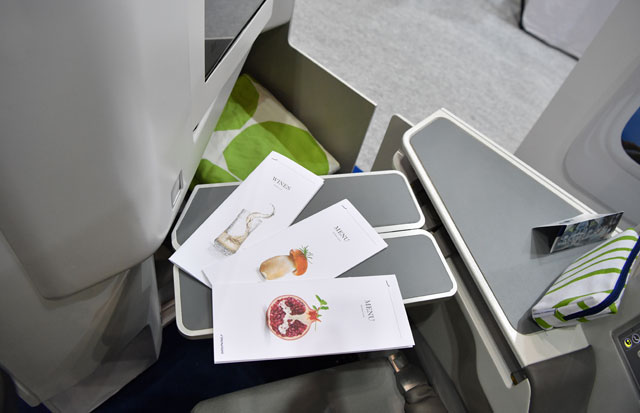 ビジネスクラスのシートはフルフラットになるタイプで、寝具などはフィンランドを代表するファッションブランド「マリメッコ」のものを採用している。