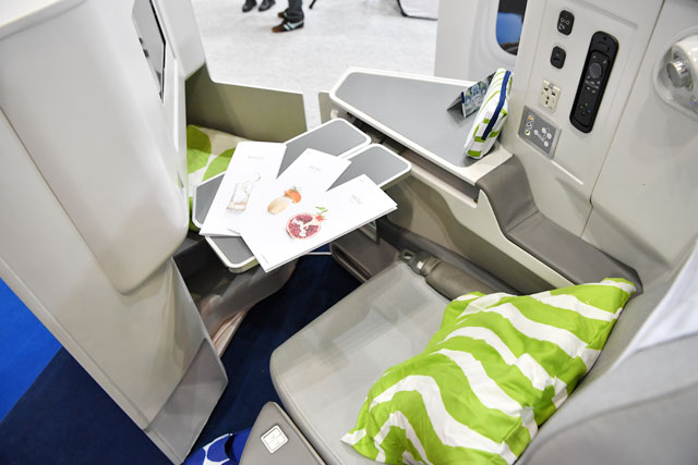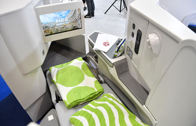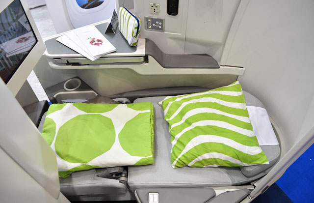 マリメッコの寝具を使ったフィンエアーのA350のビジネスクラスシート=16年9月23日 PHOTO: Tadayuki YOSHIKAWA/Aviation Wire