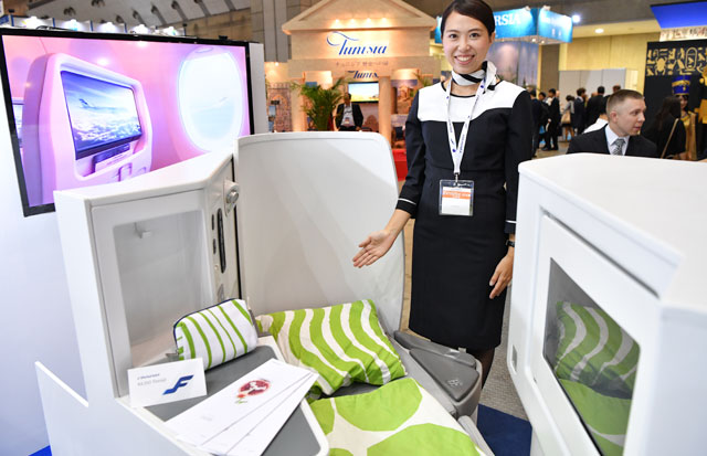 フィンエアー(FIN/AY)は、東京・お台場の東京ビッグサイトで9月25日まで開催中のツーリズムEXPOジャパン(主催:日本観光振興協会日観振、日本旅行業協会)で、最新鋭機エアバスA350 XWBのビジネスクラスシートの体験コーナーを設けている。同社のA350は日本への正式就航を前に、10月に機材変更で初飛来する見通し。