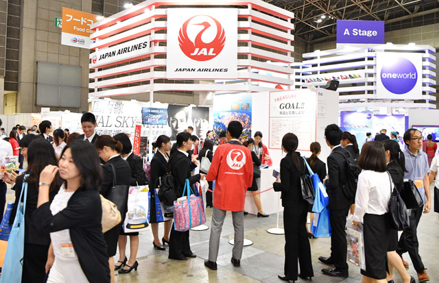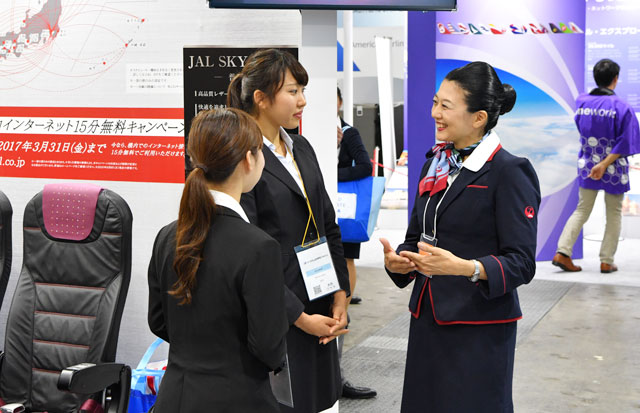 ツーリズムEXPOに来場した学生と話すJALの客室乗務員=16年9月23日 PHOTO: Tadayuki YOSHIKAWA/Aviation Wire