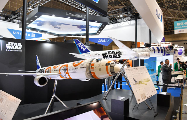 全日本空輸(ANA/NH)も、加盟する「スターアライアンス」の各社と出展。スター・ウォーズの特別塗装機の大型模型を展示し、足を止めて記念写真を撮る人が多かった。