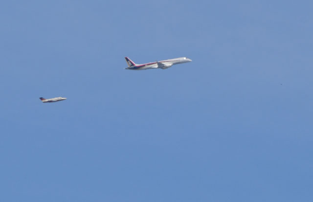 三菱重工の随伴機とともに試験空域へ向かうMRJの飛行試験4号機=16年9月25日 PHOTO: Tadayuki YOSHIKAWA/Aviation Wire
