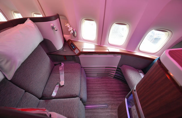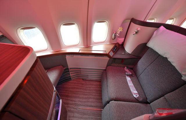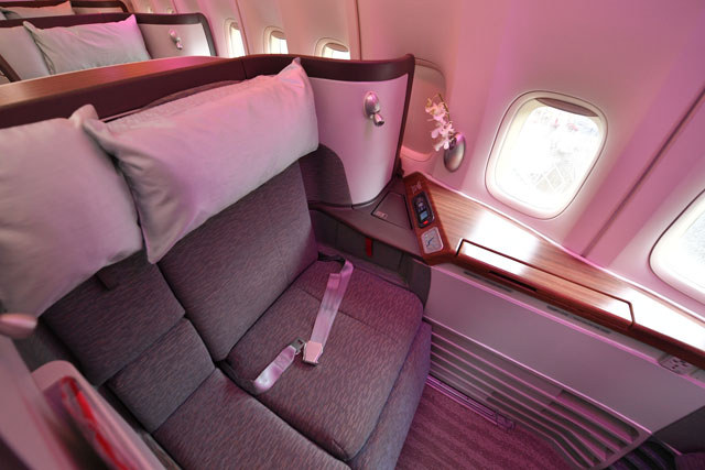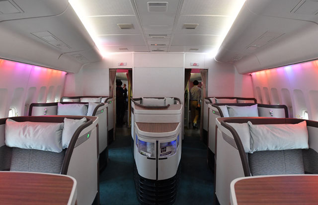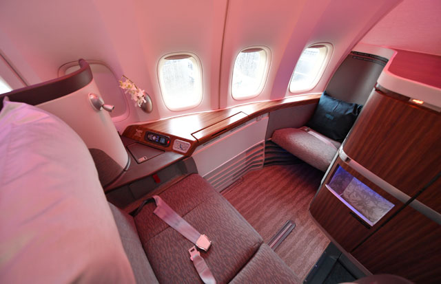 ファーストは「艦長席」とも言われる中央席が特徴。一方、ビジネスのシートは通路側に足が向く配列のため窓から景色が見にくく、ボーイング777型機に採用された改良型では、窓側に足が向くようになった。