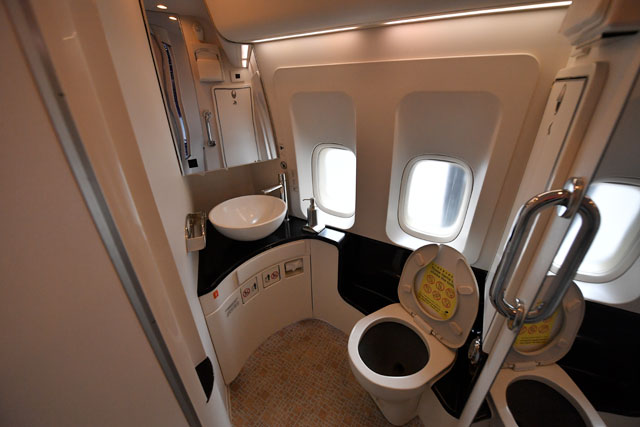 キャセイパシフィック航空の747-400のファーストクラス近くの化粧室には窓がある=16年10月1日 PHOTO: Tadayuki YOSHIKAWA/Aviation Wire