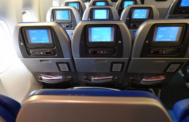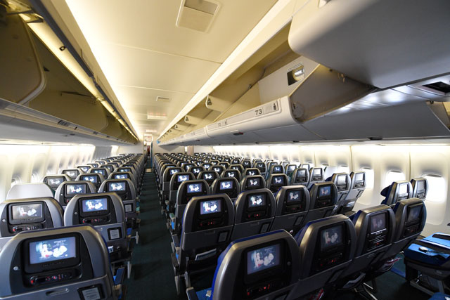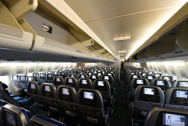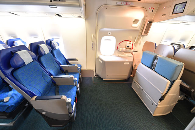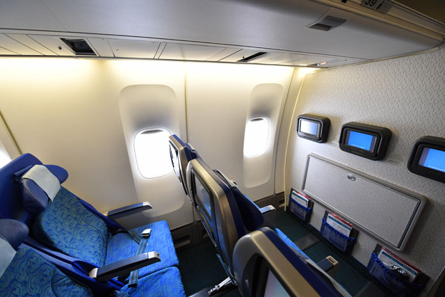 座席数は359席。メインデッキ(1階席)がファーストクラス9席、ビジネスクラス24席、プレミアムエコノミークラス26席、エコノミークラス278席、アッパーデッキ(2階席)がビジネスクラス22席だった。
