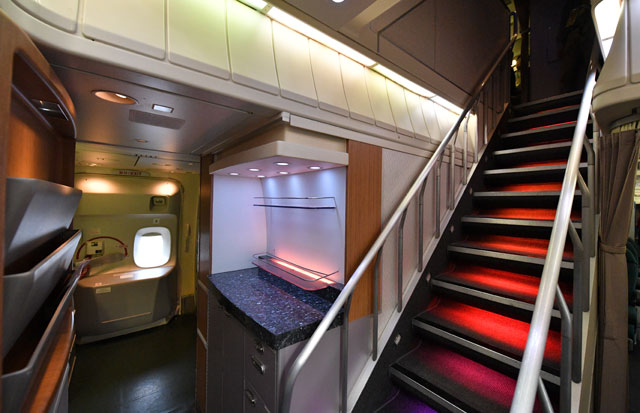 ジャンボの特徴である2階席へ向かう階段は、紫から赤、オレンジと1段ごとにグラデーションの照明に照らされ、幻想的な雰囲気を醸し出していた。また、ファーストクラス付近のラバトリー(化粧室)には窓があった。
