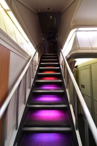 キャセイパシフィック航空の747-400の2階席へ向かう階段。紫から赤、オレンジのグラデーションで1段ごとに照らされている=16年10月1日 PHOTO: Tadayuki YOSHIKAWA/Aviation Wire