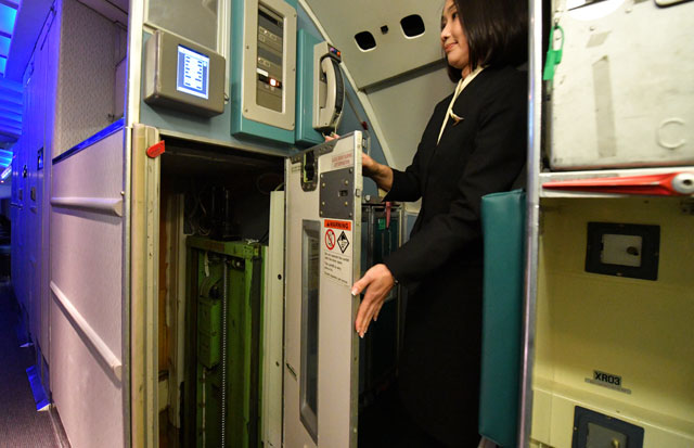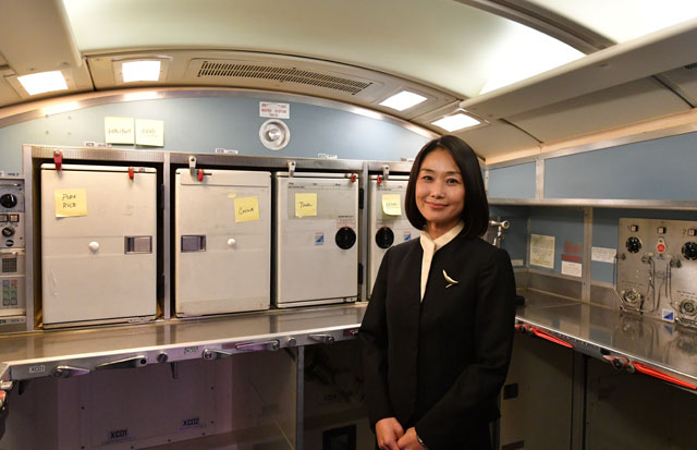 2階席後方のビジネスクラス用ギャレーを紹介するキャセイパシフィック航空の客室乗務員=16年10月1日 PHOTO: Tadayuki YOSHIKAWA/Aviation Wire