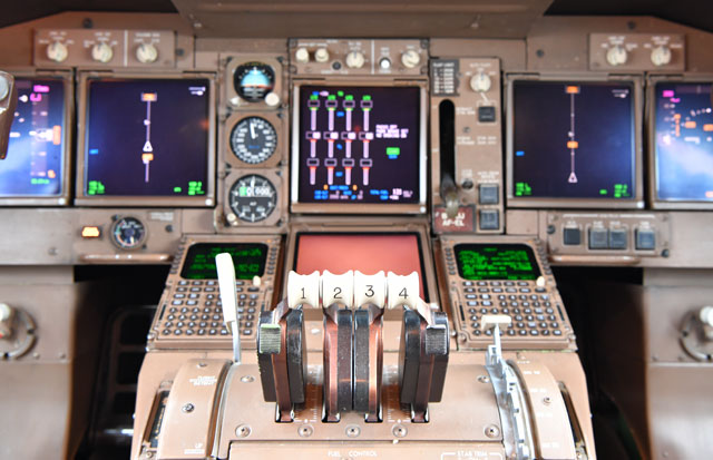 今では珍しくなった4本ある747-400のスラストレバー=16年8月8日 PHOTO: Tadayuki YOSHIKAWA/Aviation Wire