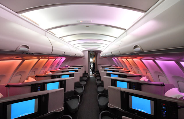 座席数は359席。メインデッキ(1階席)がファーストクラス9席、ビジネスクラス24席、プレミアムエコノミークラス26席、エコノミークラス278席、アッパーデッキ(2階席)がビジネスクラス22席だった。