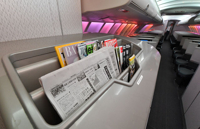 キャセイパシフィック航空の747-400の2階席ビジネスクラス階段付近にあるマガジンラック=16年10月1日 PHOTO: Tadayuki YOSHIKAWA/Aviation Wire