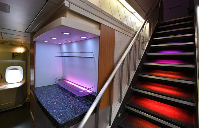 キャセイパシフィック航空の747-400の2階席へ向かう階段。紫から赤、オレンジのグラデーションで1段ごとに照らされている=16年10月1日 PHOTO: Tadayuki YOSHIKAWA/Aviation Wire