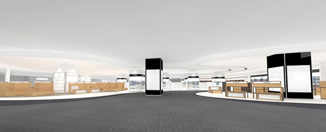 出国審査後の制限エリアには、国内の空港では初めてウォークスルー型のショッピングエリアを設置。免税店や物販店、レストラン、ATM、両替所が設けられる。関西エアポートでは、保安検査の待ち時間を短縮することで、利用者にショッピングエリアで買い物や食事をしてもらい、非航空系収入の拡大を目指す。