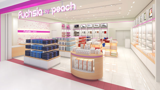 ショッピングエリアには、ピーチの免税店「Fuchsia by peach」や時計店、ドラッグストア、カフェなど、約30店舗がテナントとして入る。