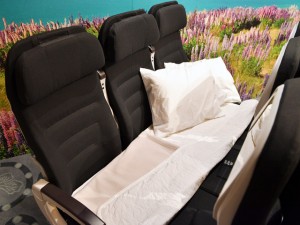 横一列3座席が平らなソファになるニュージーランド航空のエコノミークラス「スカイカウチ」=16年11月4日 PHOTO: Tadayuki YOSHIKAWA/Aviation Wire