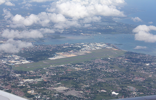 マクタン・セブ空港上空を飛行するJW602便からの風景。海を挟んで奥がセブ島、手前がマクタン島=16年12月26日 PHOTO: Yusuke KOHASE/Aviation Wire