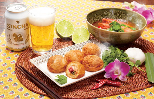 ピーチが1月から提供するトムヤムクンたこ焼(中央)とシンハービール(左)(ピーチ提供)