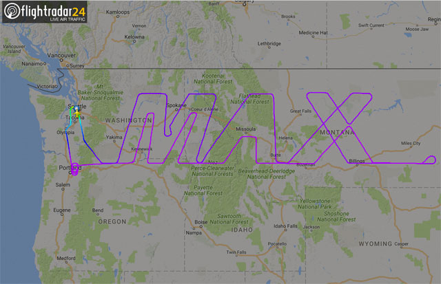 ワシントン州からモンタナ州にかけて737 MAXが「MAX」と描いた試験飛行の経路(フライトレーダー24から)