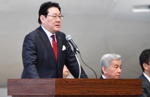 入社式で「成長というものを誤解していただきたくない」と新入社員に訓示するJALの植木社長=17年4月3日 PHOTO: Tadayuki YOSHIKAWA/Aviation Wire