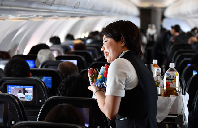 スターフライヤーの北九州発那覇行き初便の機内で飲み物を配る客室乗務員=17年7月4日 PHOTO: Tadayuki YOSHIKAWA/Aviation Wire