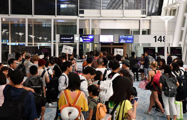 羽田空港の148番搭乗口前に並ぶニュージーランド航空オークランド行きNZ92便の乗客=17年7月22日 PHOTO: Tadayuki YOSHIKAWA/Aviation Wire