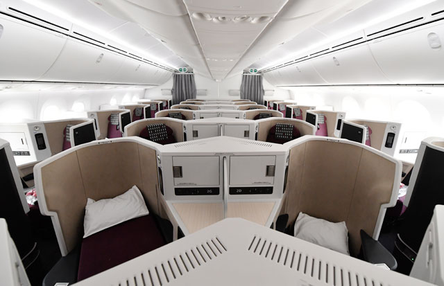 ビジネスクラス「スカイスイートIII」は、1-2-1席のヘリンボーン配列を採用することで、全席から通路へアクセス出来るようにした。シートを足もとで立体交差させた。