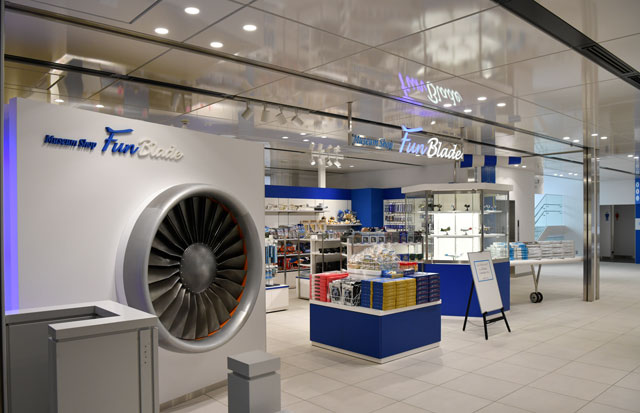 1階の出口付近には、ミュージアムショップを設置。ボーイングやエアバスをはじめとする航空関連グッズや、同館オリジナルの商品もそろえた。