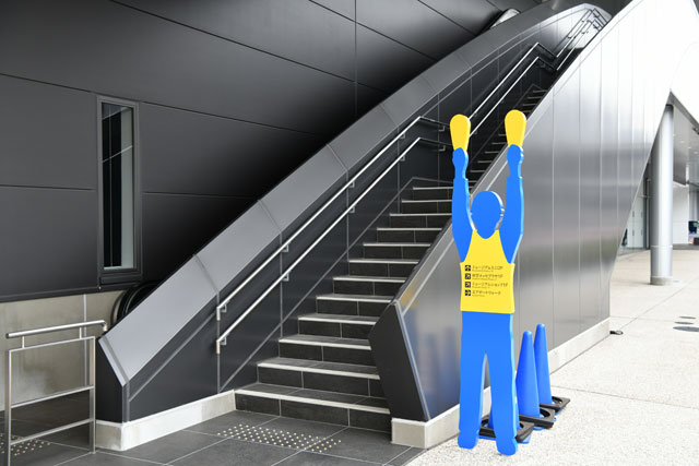 バスの降車位置を示すマーシャラーをイメージしたあいち航空ミュージアムの標識=17年11月20日 PHOTO: Tadayuki YOSHIKAWA/Aviation Wire