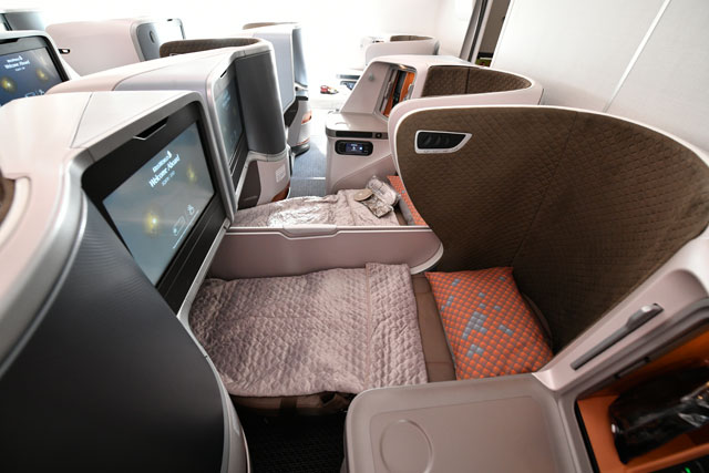 シートは、シンガポール-関西線などアジア域内路線用に新開発したもの。ビジネスクラスは、1-2-1席のスタッガード配列のステリア・エアロスペース製フルフラットシートを採用。既存の2-2-2席配列と異なり、全席が通路に面している。