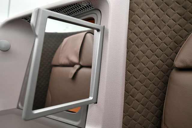 関空で日本初公開されたシンガポール航空の787-10のビジネスクラス新シートの収納スペース脇に設けられた鏡=18年4月4日 PHOTO: Tadayuki YOSHIKAWA/Aviation Wire
