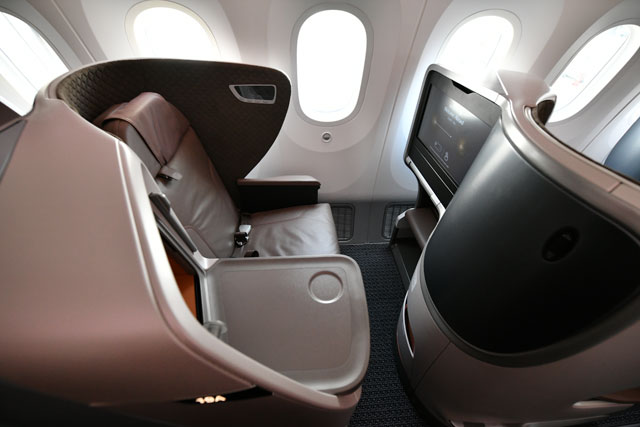 パーティションで仕切ることもできる関空で日本初公開されたシンガポール航空の787-10のビジネスクラス新シート中央席=18年4月4日 PHOTO: Tadayuki YOSHIKAWA/Aviation Wire