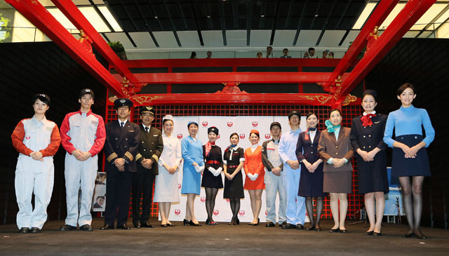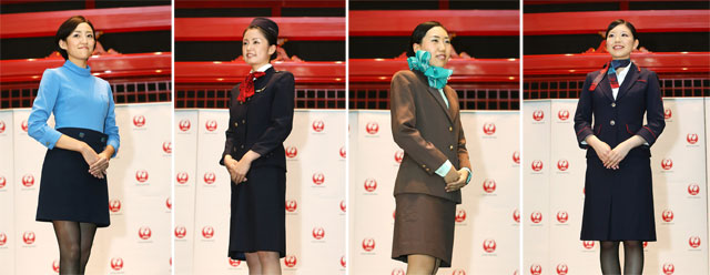 披露された制服は、客室乗務員5種類と空港係員4種類、運航乗務員と整備士、グランドハンドリング係員が各2種類の計15種類。客室乗務員と空港係員は、旧日本エアシステム(JAS)の制服も紹介された。