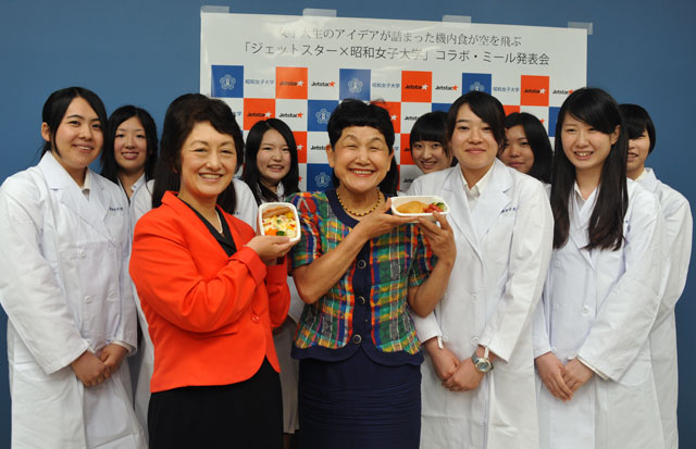 昭和女子大生が開発した機内食を手にするジェットスター・ジャパンの鈴木社長と同大の板東学長=7月7日 PHOTO: Yusuke KOHASE/Aviation Wire