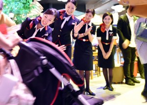 JALは16日に、親子連れのマイレージ会員向けに千葉・幕張の職業体験型テーマパーク「カンドゥー」でイベントを開催。子供たちはパイロットや客室乗務員、マーシャラーの仕事を体験したほか、JALの歴代制服ファッションショーも開かれ、客室乗務員と記念写真に収まる子供たちの姿が多く見られた。