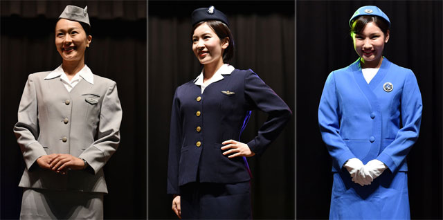 JAL客室乗務員の(左から)初代、3代目、4代目制服=9月16日 PHOTO: Tadayuki YOSHIKAWA/Aviation Wire
