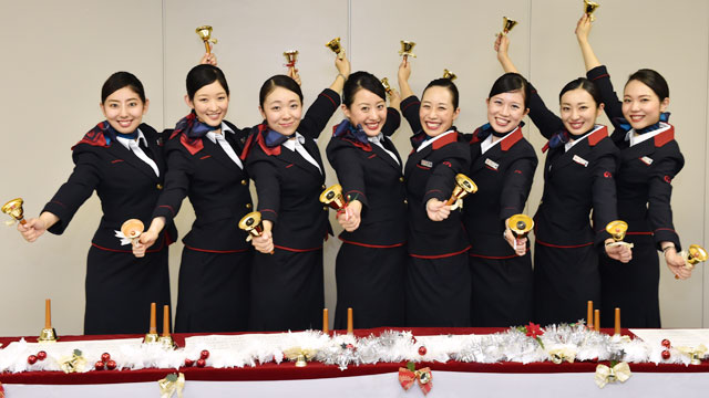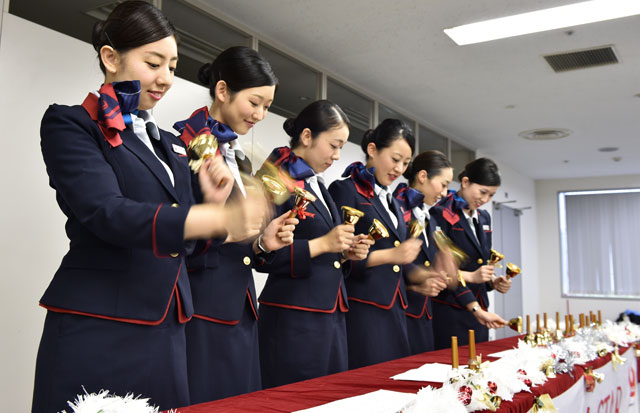 JALでは毎年年末に、ベルスターによるミュージックベル演奏を各地で披露している。同社は経営破綻によりCAの採用を一時中断していたが、昨年は3年ぶりに新入社員が参加。20年目の今年は、入社3年目と1年目が1人ずつ、2年目が6人の計8人がミュージックベルを披露する。