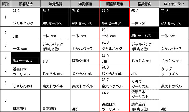 顧客満足度の2位は76.4点で一休(2450)が運営する一休.com、3位は76.3点で日本航空(JAL/JL、9201)系列のジャルパック、4位が74.9点のJTB、5位が74.8点でリクルートライフスタイルが運営するじゃらんnet、6位に73.7点の楽天(4755)系列の楽天トラベル、7位に73.5点の近畿日本ツーリストがランクインした。