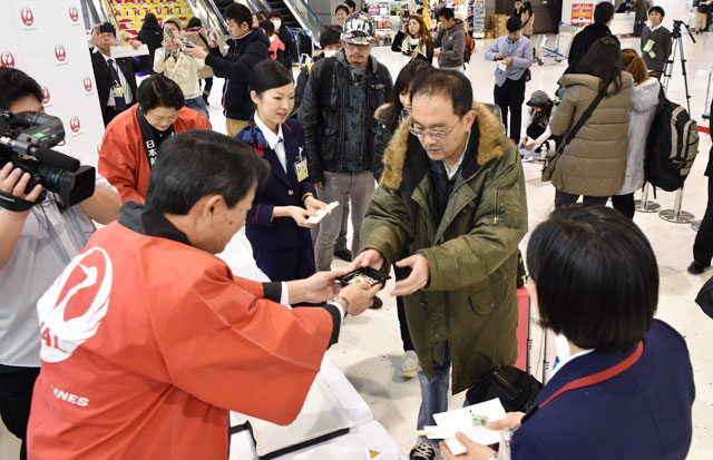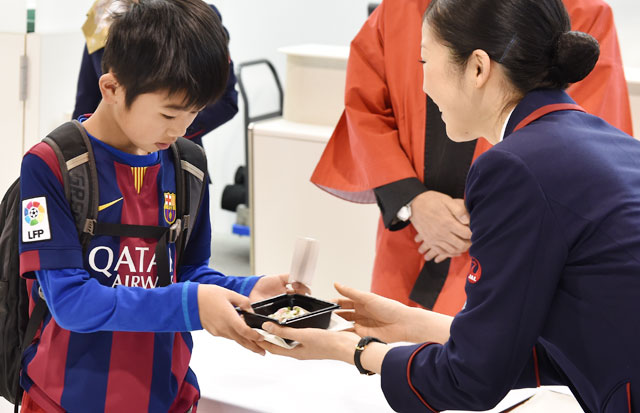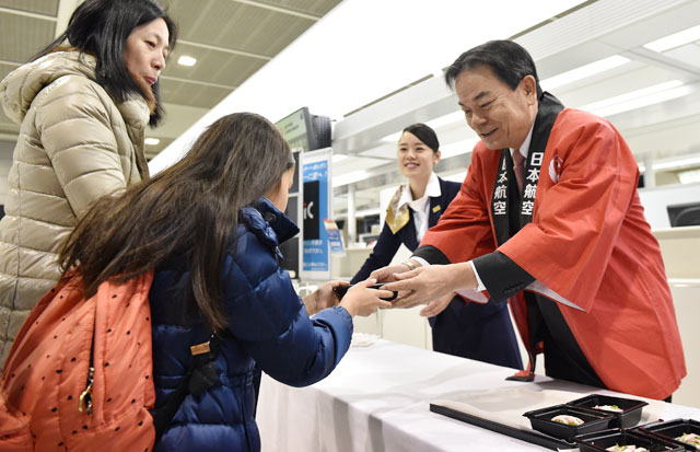 JALのカウンター前では、佐藤信博副社長や空港係員ら10人が出発客に声を掛け、200食を配った。成田では、昼前までに出発便のピークを迎える。