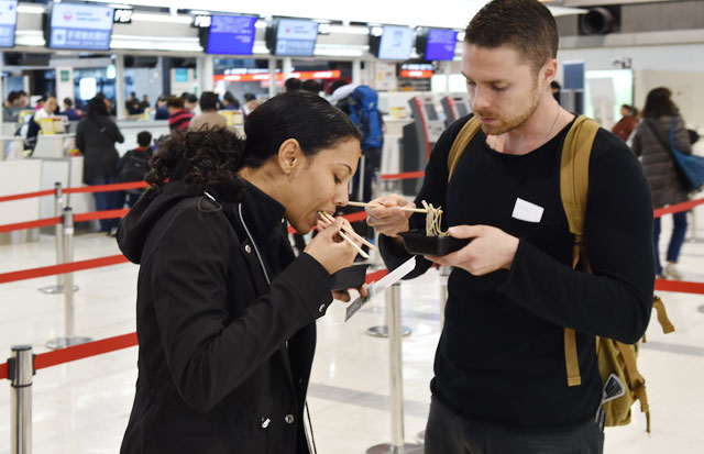 JALの空港係員から年越しそばを手渡される外国人客=12月31日 PHOTO: Tadayuki YOSHIKAWA/Aviation Wire