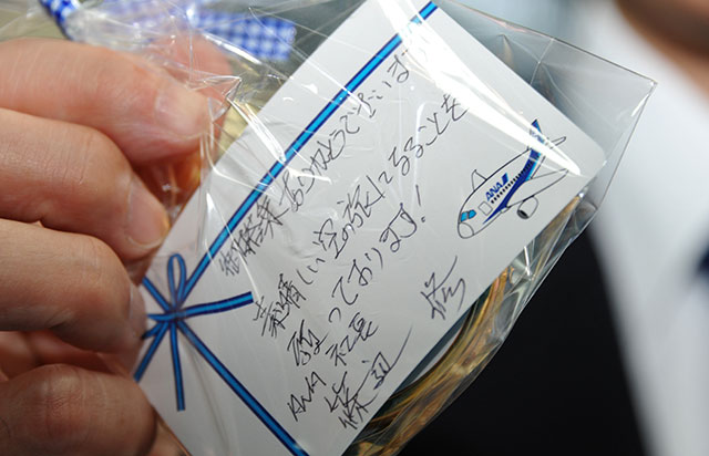 授与式のあとは、受賞記念のチョコレートを、羽田国際線ターミナルのチェックインカウンターやロビーで配付。ANA社員が直筆でメッセージを書き、400個以上を用意した。ロビーでは同社スタッフや芳賀さんに交じり、篠辺社長も配った。