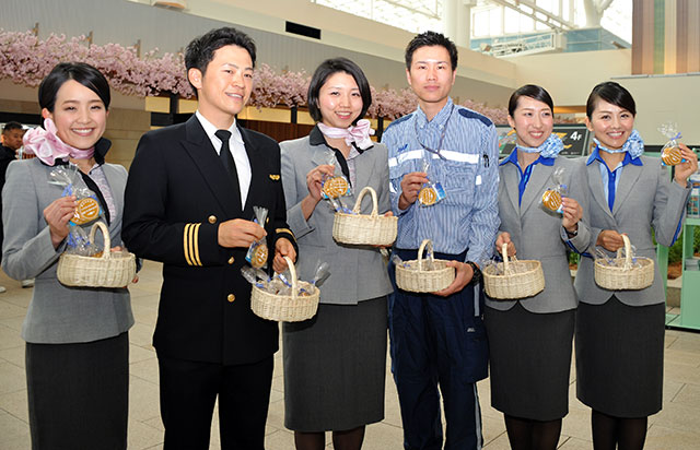 記念のチョコは羽田のほか、成田空港でも配付した。