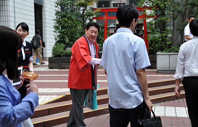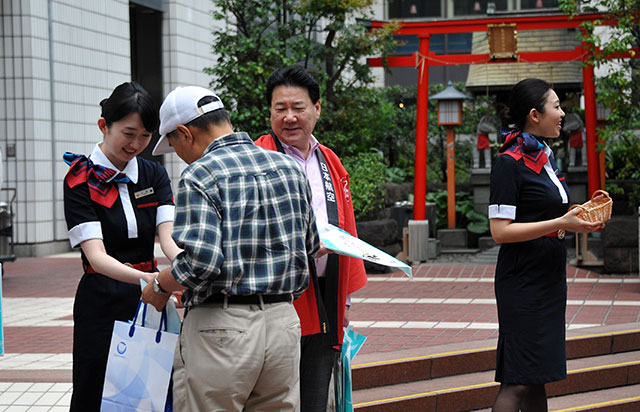 有楽町の人々にパンフレットを配る植木社長(中)=6月22日 PHOTO: Yusuke KOHASE/Aviation Wire
