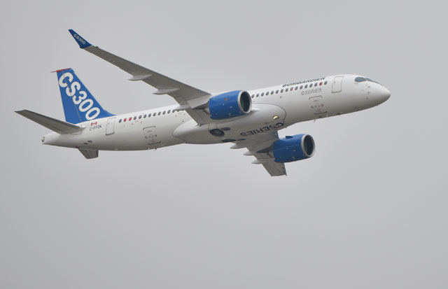 昨年のファンボロー航空ショーでは、CS100のモックアップ展示のみで、実機の地上展示やデモフライトは、エンジントラブルの原因究明などの影響を受け、行われなかった。今年は一転し、6月のパリ航空ショーでは、CS100の飛行試験5号機(FTV5、登録番号C-GWXZ)が地上展示され、3月に初飛行に成功したCS300は、地上展示のほか、デモフライトで低騒音をアピールした。