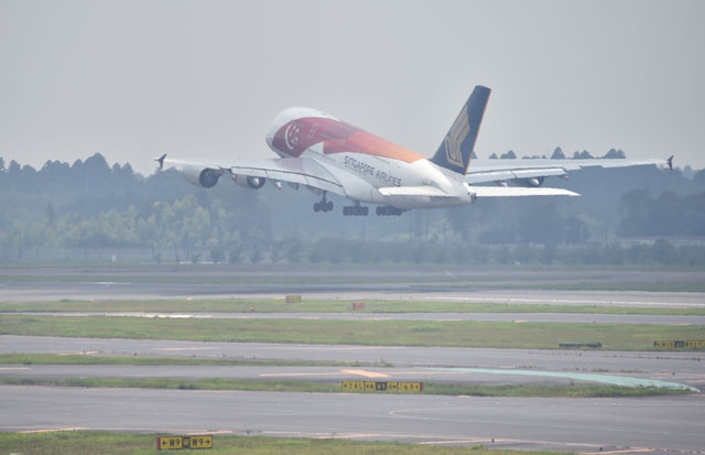 成田空港を離陸しシンガポールへ向かう建国50周年特別塗装機=8月4日 PHOTO: Tadayuki YOSHIKAWA/Aviation Wire