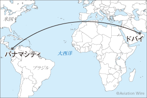 飛行時間はドバイ発が17時間35分。パナマシティ発は15時間45分。両都市間の直線距離は約1万3806キロ。