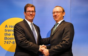 固く握手を交わすブンケンブルク氏(左)とガーナートCEO=10月20日 PHOTO: Yusuke KOHASE/Aviation Wire