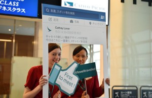 Facebookで新塗装機への「いいね!」を呼びかけるキャセイパシフィック航空の地上旅客係員=11月2日 PHOTO: Tadayuki YOSHIKAWA/Aviation Wire