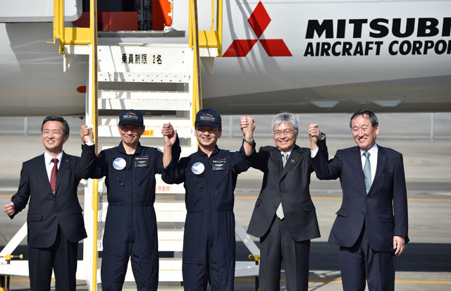 初飛行を終え記念撮影に応じる(左から)三菱航空機の森本社長、安村機長、戸田機長、三菱重工の大宮会長、鯨井副社長=11月11日 PHOTO: Tadayuki YOSHIKAWA/Aviation Wire