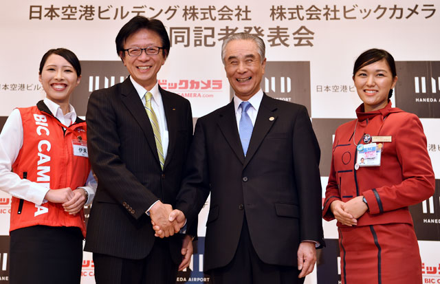 家電中心の空港型免税店を運営する合弁会社設立で合意し握手を交わす日本空港ビルの鷹城社長(中央右)とビックカメラの宮嶋社長=12月17日 PHOTO: Tadayuki YOSHIKAWA/Aviation Wire