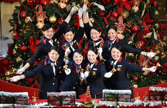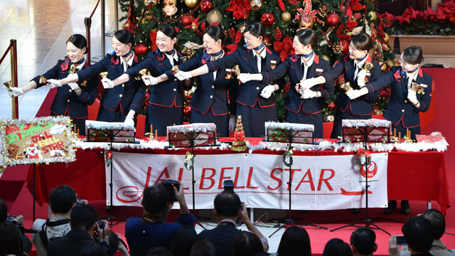 クリスマス恒例となった日本航空(JAL/JL、9201)の新人客室乗務員(CA)有志によるミュージックベル演奏チーム「JALベルスター」。毎年年末に、各地でミュージックベル演奏を披露している。